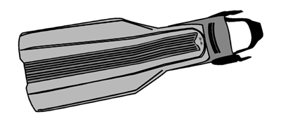 It’s this push-back that provides much of the propulsion created by a moving fin. Just as the sole of your foot encounters resistance (and thus creates propulsion) when you swim, fins encounter resistance and create propulsion as well. But fins work better than bare feet because their surface area is larger (thus encountering more water for that critical resistance), and – on most modern fins – the undulating motion of the fin provides resistance in both motions of the kick cycle (i.e., the up-motion power stroke as well as the down-motion return stroke, when the fin acts like a scoop being moved through the water).
